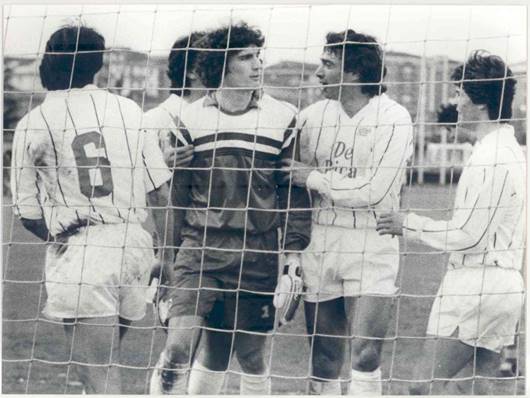17 marzo 1985, Piacenza-Rondinella 2-0. A sinistra Snidaro festeggiato